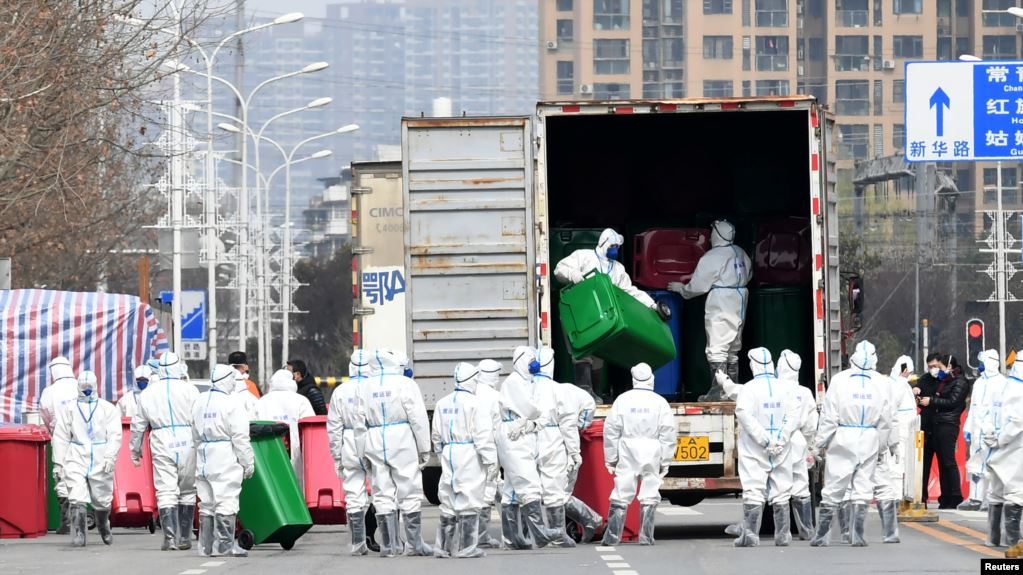 身穿防护服的工人在清理清理武汉华南海鲜市场。这里曾被认为是新冠病毒的发源地。(2020年3月4日)