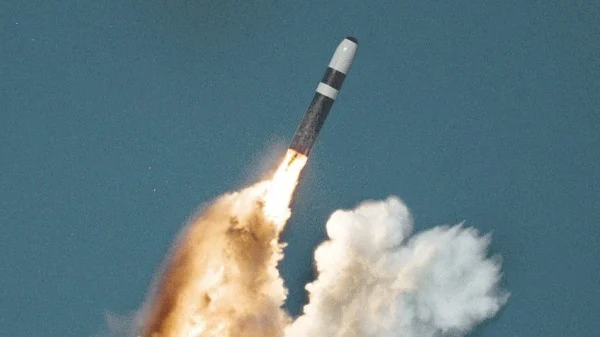五角大楼表示,预计未来十年内,北京的核弹头数量将从现在的约200多颗至少翻一倍,并且接近有进行从陆、空和海进行核打击的能力(也称核三位一体)。图为美国核武三叉戟II型弹道飞弹。(图片来源: 中央社图)