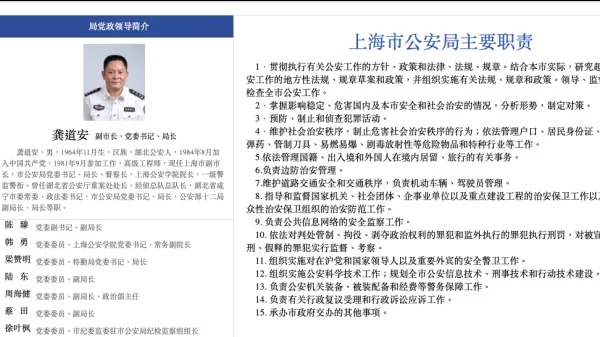 因涉嫌严重违法行为,上海市副市长、市公安局局长龚道安落马。(图片来源:中共上海市公安局官网截图)