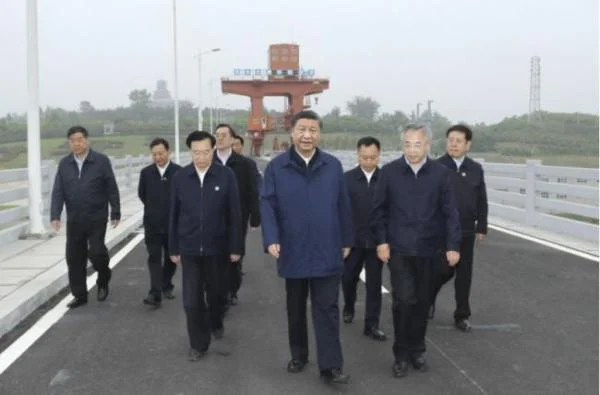 2021年5月13日下午,胡春华(右)陪同习近平到河南淅川县,乘船考察丹江口水库。(图片来源:网络)