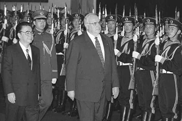 1995年,德国总理赫尔穆特·科尔(Helmut Kohl)跟李鹏在北京见面。科尔此行重点是加强与中共的经济联系,重启因1989年天安门大屠杀后中断的德国与中共的军事合作。(ROBYN BECK/AFP via Getty Images)