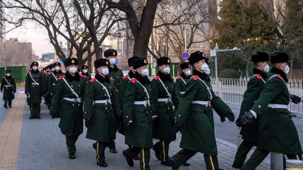 大疫冲击政局,涉北京防务的军方关键人物接连异动。图为一队军警戴着口罩行走在北京街头。(图片来源: NICOLAS ASFOURI/AFP via Getty Images)